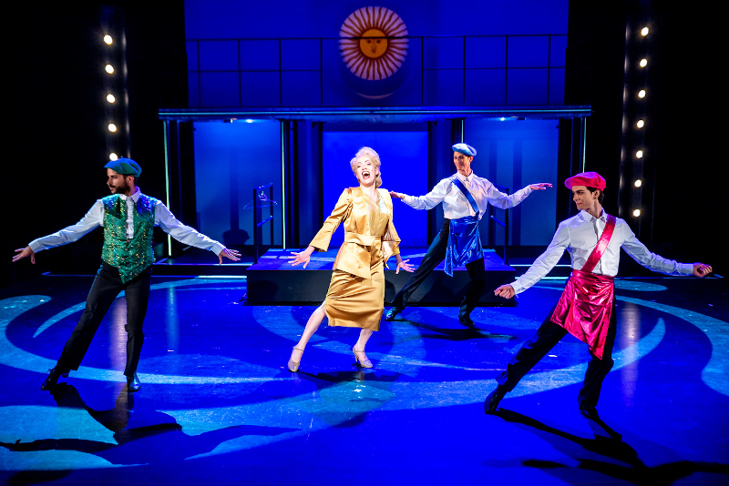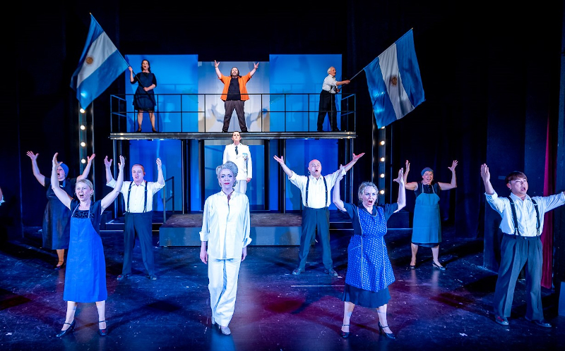 „Der von Jan Rozehnal einstudierte Opernchor und das von Mario Mariano choreographierte Ballett des Hauses gehen mit ihrem Einsatz, lateinamerikanisches Tangoflair, die Arroganz der Oberschicht und die Hoffnung der einfachen Leute zu verdeutlichen, mit Vehemenz bis an ihre Grenzen. … Tobias Amadeus Schöner ist genau der Richtige für die klaren Worte der Kritik an der Personifizierung einer Melange aus charismatischem Populismus und skrupelloser Machtgier und ihrer Inszenierung als Ikone der Macht.“ (Joachim Lange, Volksstimme)