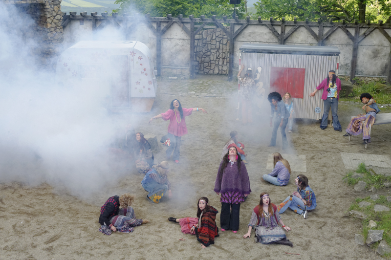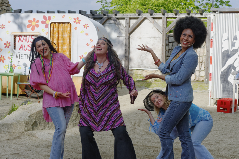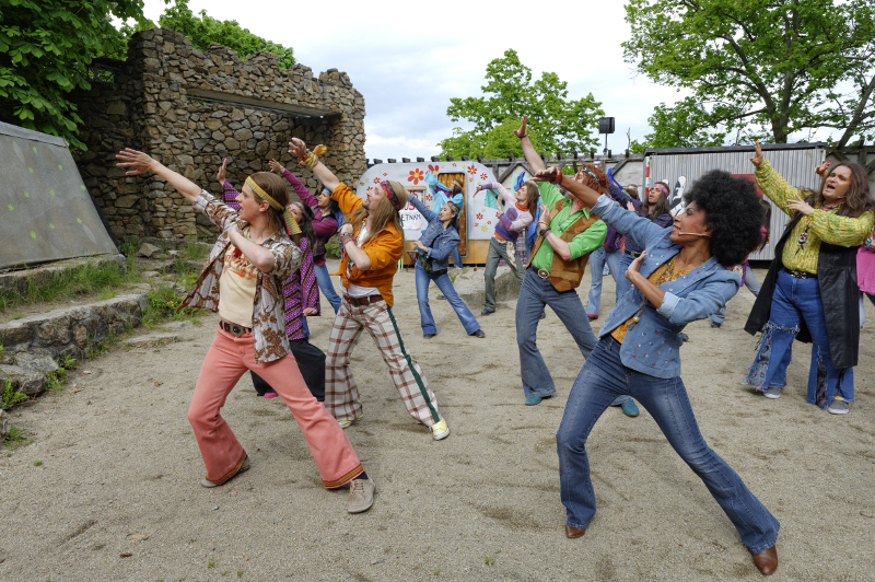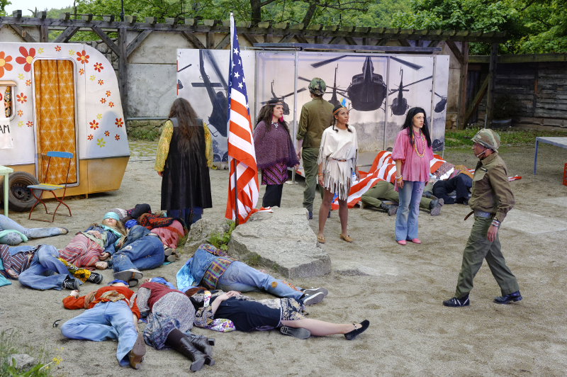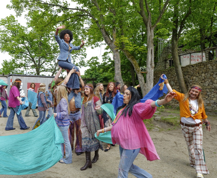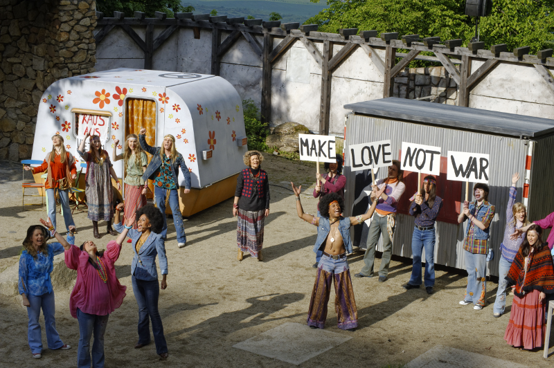 K.S: Meine Version von HAIR ist ein Doppelkonzept, zuerst für die Freilichtfestspiele im Harzer Bergtheater, anschließend für die Theaterhäuser in Halberstadt und Quedlinburg. Gemeinsam mit dem Choreographen Mario Mariano (der als "Hud" auch auf der Bühne steht) habe ich dieses Stück als Rükblick von heute in die 68er Jahre angelegt. Das Ensemble setzt sich zusammen aus Musicalprofis, Solisten von Oper und Schauspiel, dem Ballettensemble und jungen Laiendarstellern. Sie alle sind in kurzer Zeit zu einem echten "Tribe" zusammengewachsen.