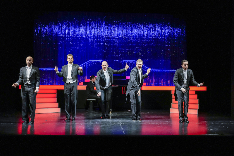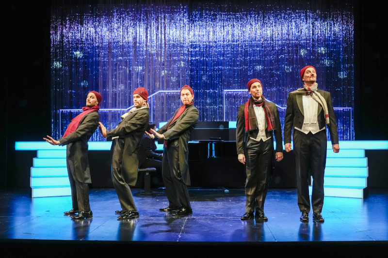 Mit der eleganten Leichtigkeit der fünf schönstimmigen Herren im Frack springt der Abend durch eine bunte Auswahl von Stilen und Themen: durch 20er-Jahr-Couplets und Freundschafts-Lieder, Mann-und-Frau-Sujets, durchs herbstliche Sauwetter und die Schneeseligkeit. Er wird mit Schubert, Chopin und »Adeste Fideles« still und leise, um dann mit »Feliz Navidad« die Hüften zu schwingen. … Diese Musik macht derart gute Laune, und das Lachen tut so gut, um sich neue Kraft zu holen für den zermürbenden Kampf gegen das Virus und all den Streit da draußen. Theater stärkt Moral und Seele, das ist die Botschaft.